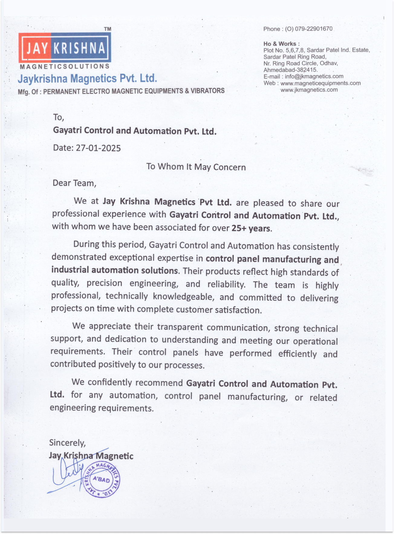 Established in 1995, Gayatri Control and Automation Private Limited in a short span has taken giant strides and carved a unique niche for itself as a leader in the world of Control Panels. An ISO 9001:2000 company since 2003, GCAPL name is today a recognised and very well established name known in the Automation Industry for its top end quality Control Panels — custom made as per the requirements and specification of different customers. Thanks to the approach of providing consistent, accurate and quality products, GCAPL has successfully developed a wide customer base not only in Gujarat and India but also overseas.